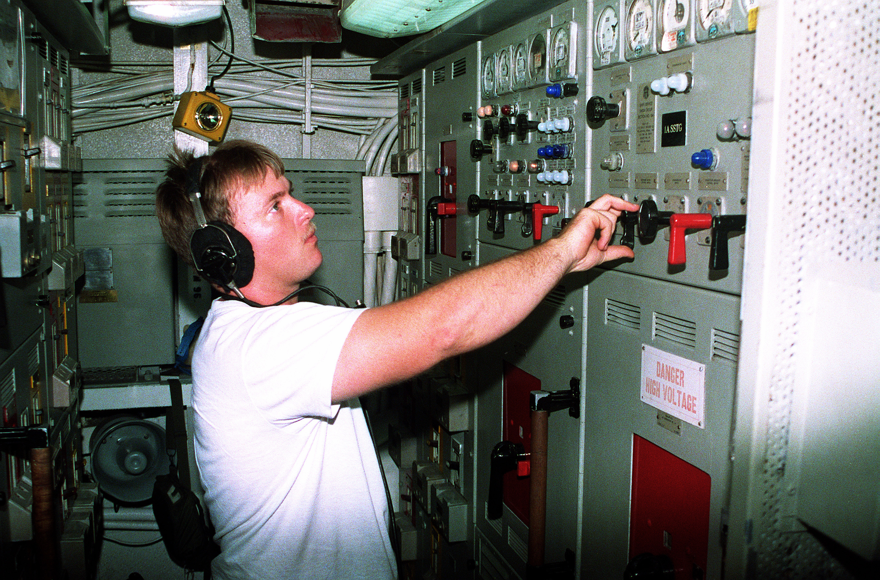 Electrician's Mate 3rd Class McCoy monitors guages on a ship's service switchboard in the No. 1 engine room aboard the guided missile destroyer USS GOLDSBOROUGH (DDG-20) during Operation Desert Shield