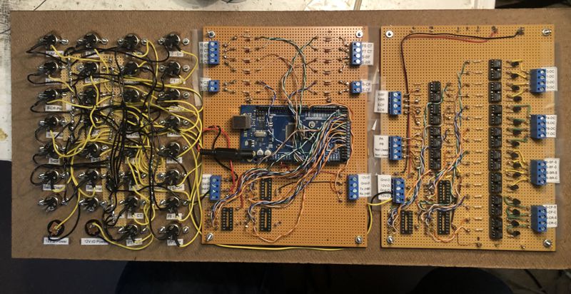Since my layouts are tempory, but still soemwhat complex, I've made some effort to improve reliability of the wiring. One thing that really helps is to use terminal strips and wiring with spade terminals. For the accessory buttons, I mounted them onto a piece of wood and wired them to a terminal strip. I've found that a 7 connector terminal strip works great: