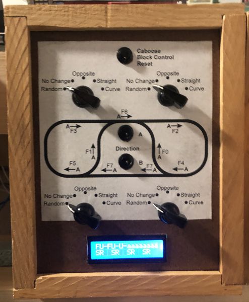 The control interfaces allows the operator to choose how the direction for each switch is established when the train approaches the common end. Options include "no change", "opposite", "random", "always straight", and "always curve." A 2 line serial display shows the current block the train is in, the last block the train is in, the polarity of the current block, the polarity of each of 8 blocks, and whether the current sensor detects a train in the block, the direction of each of the switches, the switch control setting, and which switch coils are energized. Each switch has a switch direction sensor that is used to display the direction of each switch.
